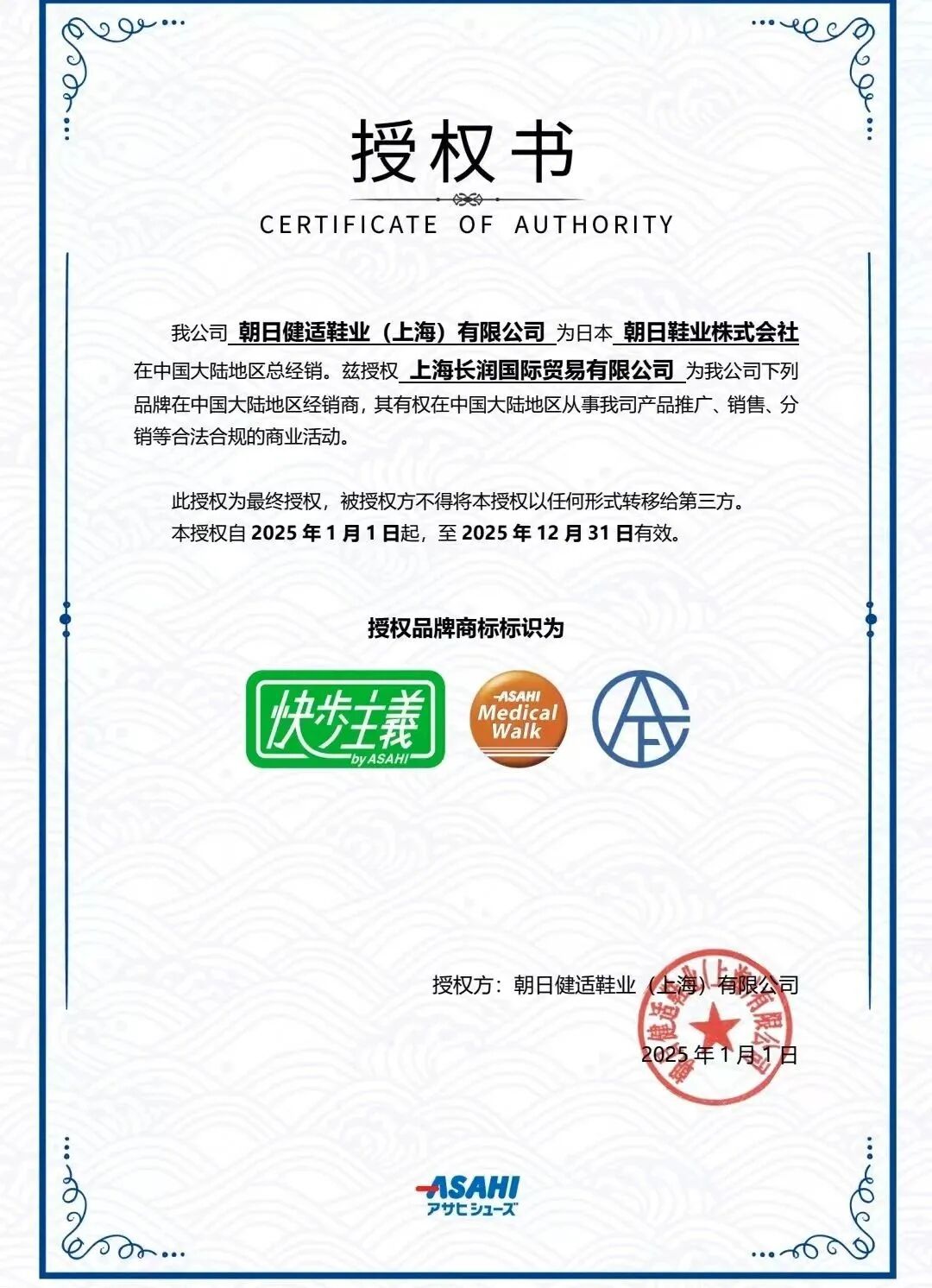 今年初,长润国际贸易有限公司与朝日健适鞋业(上海)有限公司达成重要合作,长润国际贸易获授权成为朝日鞋业旗下“ASAHI Medical Walk”“ASAHI FOOTCARE”和“快步主义 by ASAHI”品牌在中国大陆地区的经销商。自2025年1月1日起,长润国际贸易已全面着手负责该品牌在中国大陆地区的产品推广、销售及分销业务,致力于为消费者提供兼具科技与舒适的足部健康解决方案。