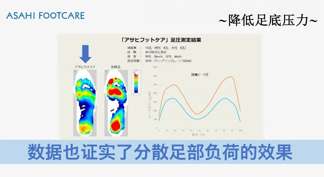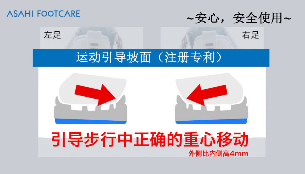 ASAHI FOOTCARE系列,依托“产学医”合作模式,由医学专家参与指导,确保鞋子内部采用特殊鞋垫设计,运用先进的减压材料,如高密度记忆海绵,能够根据患者足部的形状和压力分布进行自适应调整(引导步行中正确的重心移动),均匀分散足底压力,有效减轻足部局部压力过大带来的疼痛和不适,减少局部压迫,缓解足部疲劳和疼痛。