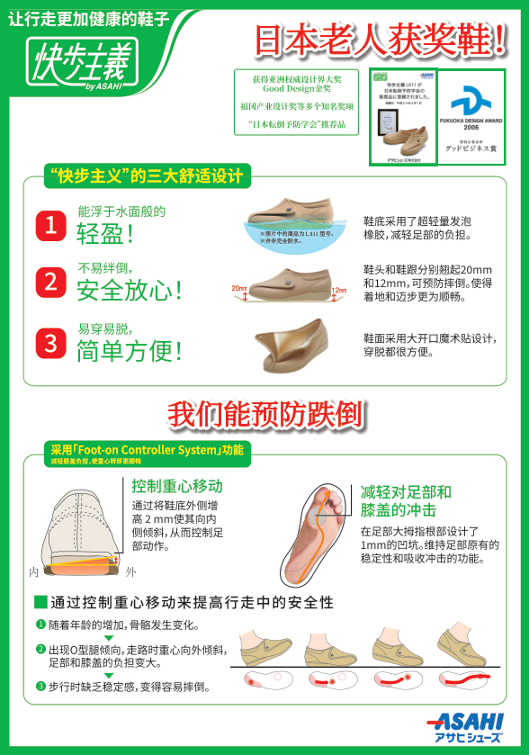 快步主义(KHS)系列专为老人防跌倒设计,优势显著。在设计方面,依据人体工程学原理,对鞋底弧度、鞋面材质等进行优化。采用「Foot-on Controller System」功能,鞋底采用符合老年人行走习惯的弧度设计,通过控制重心移动来提高行走中的安全性,可有效预防老人行走跌倒风险,并减少行走时脚底的压力集中点,有效缓解足部疲劳。该设计荣获亚洲权威设计界大奖“Good Design金奖”。