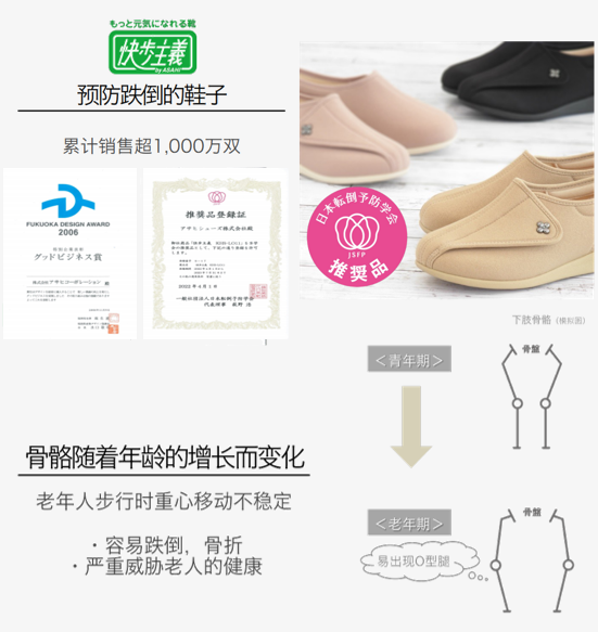 经过对国内消费需求的深入洞察和研判,在朝日旗下众多鞋履品牌中,长润特别甄选了朝日旗下极具技术竞争力和市场口碑的三大品牌来合作,三个品牌分别在“膝盖养护鞋、糖尿病足等足部养护鞋、老人防跌倒鞋”三大领域具有显著产品优势,能精准满足不同的足部护理需求。