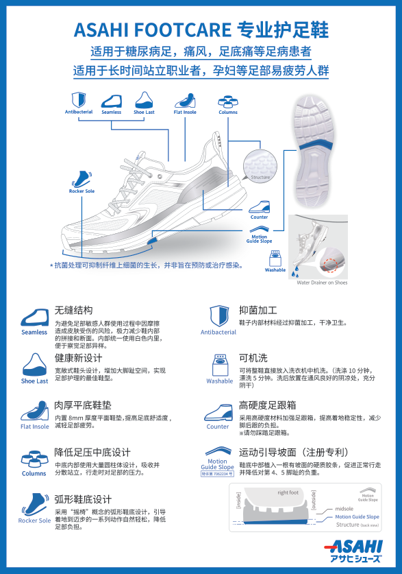 ASAHI FOOTCARE(AFC)系列是针对糖尿病足等足病患者设计的专业足部养护鞋款。糖尿病足患者因血糖问题,足部神经和血管易受损,对鞋子的要求极高。ASAHI FOOTCARE系列在设计上充分考虑这些特殊需求。