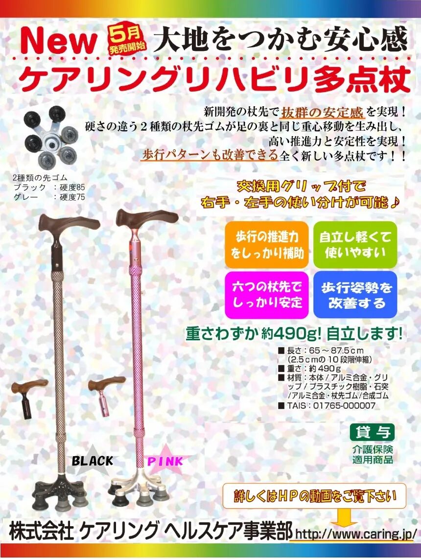 Caring是日本专业康复护理拐杖品牌,以“向更多的客户提供更好的护理服务”为宗旨,维持以董事为首的全体员工积极学习、研究,以“一切为客户”为主题,支持老年人的自立,目标是成为可提供综合性护理服务的企业。Caring多点杖,实现卓越的稳定性! 硬度不同的两种杖脚橡胶产生与脚底相同的重心移动实现高推进力和稳定性!这是一种全新的多点杖,可以改善步行模式!堪比“老年人的第三条腿”,拥有6根软硬度不同可替换脚趾作用。手型的舒适握把,配有左右手专用握把。助力增强步行的推动力,轻便易使用,有助于自立。六个杖尖,更加稳定,改善步行姿势!