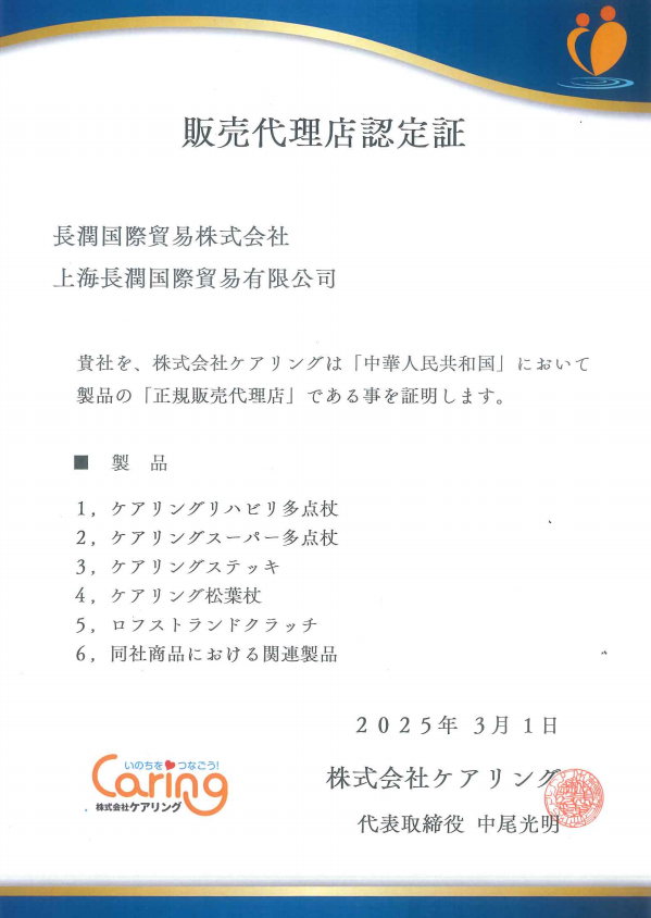 近日,长润国际贸易株式会社、上海长润国际贸易有限公司与日本知名护理拐杖品牌Caring达成重要合作,长润公司正式成为Caring在中国的官方授权代理商,这一合作标志着双方在养老领域携手迈出了坚实的一步。
