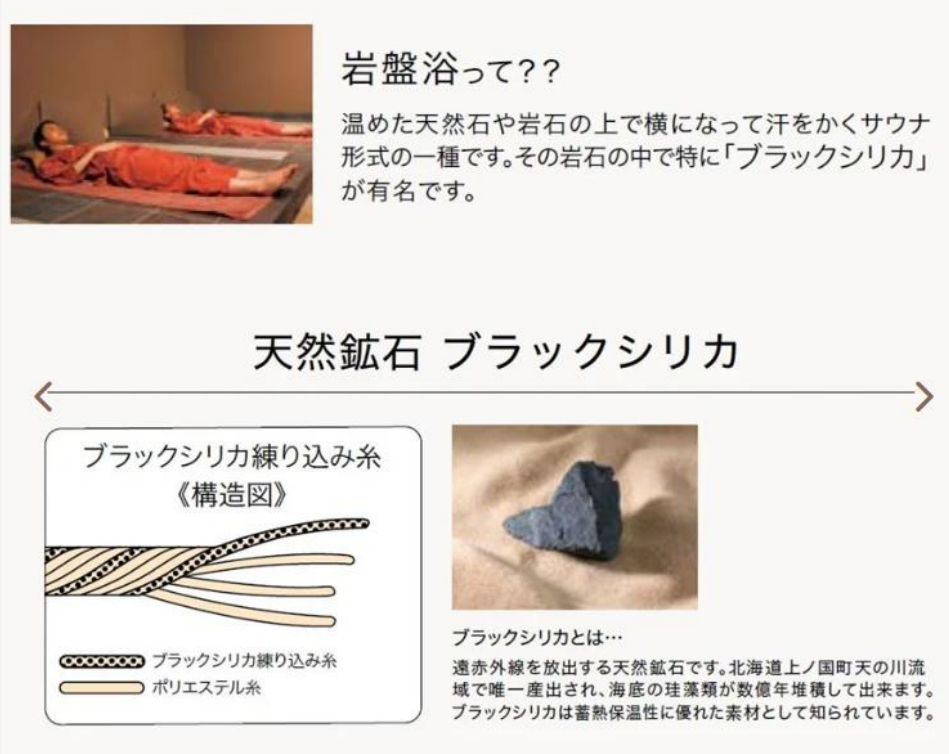 岩盘浴系列的核心竞争力,源于罗曼斯小杉对“天然矿物功能”的深度开发——将富含远红外线能量的黑硅石(黑色二氧化硅)揉入涤纶纱线,通过天然矿石的蓄热保温特性,实现“室温下持续释放温暖”的效果。
