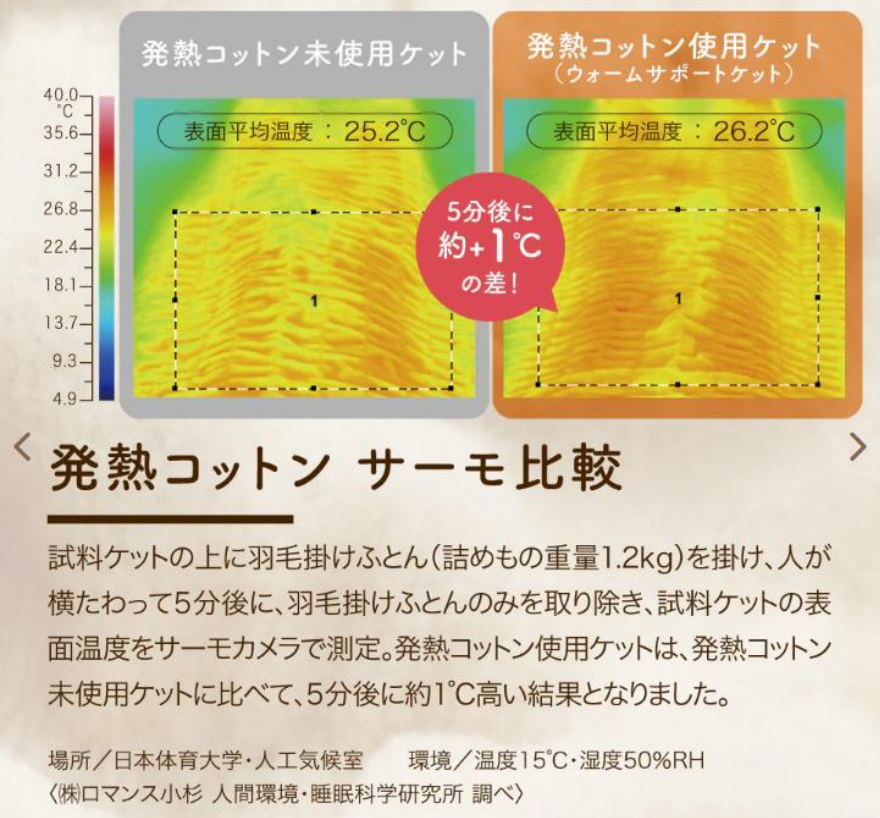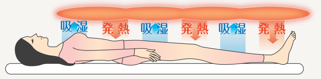 人体在睡眠中会分泌超一杯水的汗液,传统毛毯易因吸汗导致潮湿发凉,而发热棉系列能快速吸收汗液与空气中的水分,并将其转化为暖空气,实现“持续发热不闷热”的效果。日本体育大学人工气候室测试显示,使用发热棉床品5分钟后,表面温度比普通棉质床品高出约1℃,且能长期维持“不冷不热”的舒适区间。