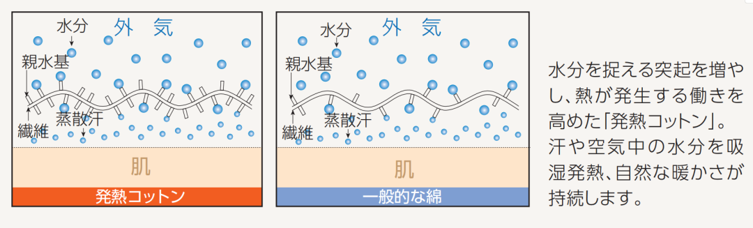 发热棉较一般棉亲水性更强,吸收人体汗液和空气中的水分,持续发热,保持自然温暖