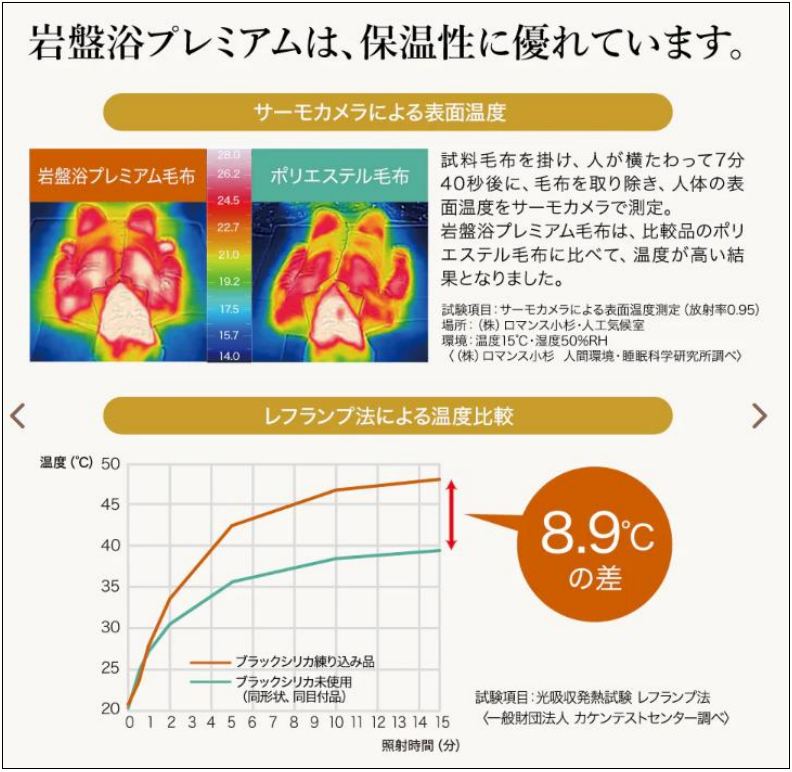 经日本专业机构测试(反射灯法),岩盘浴毛毯与普通涤纶毛毯相比,表面温度差值最高可达8.9℃,暖感更直接、更持久。